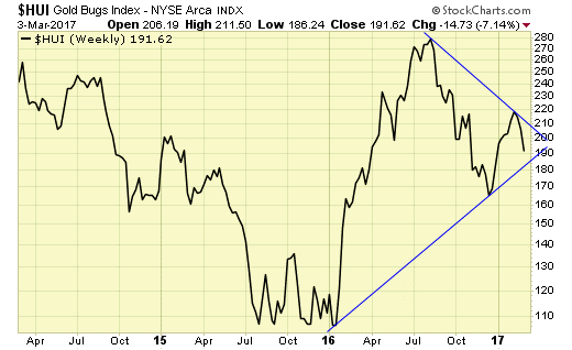 - Gold stocks as represented by $HUI is currently bound by support and resistance, and should see a break soon either way.