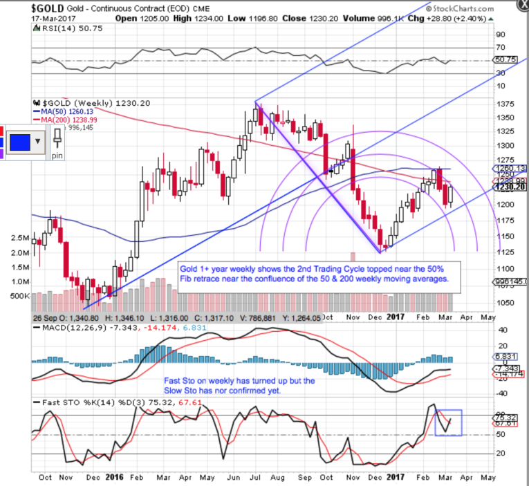 Monday will be day 6 of Gold’s third Trading Cycle (TC) out of the December 2016 Yearly Cycle Low (YCL). Gold’s longer 5-6 month Intermediate Cycle usually has four shorter Trading Cycles within it (sometimes 3 or 5 but usually 4 shorter Trading Cycles). Next week’s price action will be critical in determining if we will see a higher high in this Intermediate Cycle (IC) or just a secondary high that will set the IC downtrend line into the next IC Low which I am expecting in the May/June timeframe. Based on my cycle work, I do believe the Gold Bull has resumed, however, the transitions from Bear to Bull markets are typically epic battles that take time to play out.