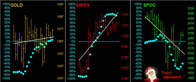 What have been on the go of late for Gold are its "Baby Blues", which day-by-day depict the consistency of the ever-evolving 21-day linear regression trend. Yet as we go to the following three-panel chart of 21-day views, whilst the blue dots have been rising on the left for Gold, price (if indeed basing) is rather stagnant, with little upside tilt to the diagonal trendline itself. Whereas in the center for the Swiss Franc as Gold's "brother-in-arms" mitigant against the Doggie Dollar, the display is clearly more upside consistent, despite the Precious Metals not keeping pace, (Silver's picture is essential that of Gold). Perhaps most poignant on the right is the trend of the S&P 500 ("SPOO" futures), for when you "see" the joyous Santa Claus rally in context, 'tis vastly superficial as to how you "hear" it broadcast: