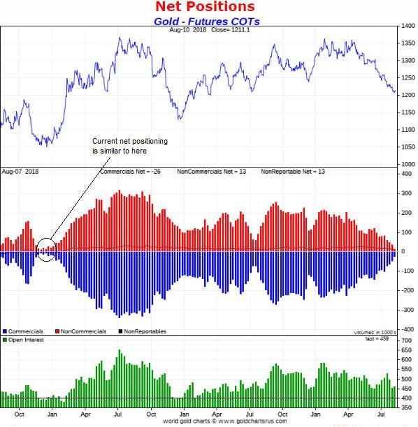 The following chart from goldchartsrus.com shows that at Tuesday 7th August (the date of the latest COT data) the net positioning of traders in gold futures was similar to what it was in December-2015, which is when a powerful 7-month rally was about to begin. Therefore, in terms of net positioning the COT situation (the most useful of all the gold-market sentiment indicators) is as bullish as it has been in many years.