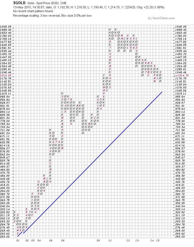The 3% X 3 box reversal chart below evidences that such a move would be more accurately be classed as a “technical” upward reaction rather than a change in direction of secondary trend. The price would have to rise above $1405 for the price target to change to become $1728 (which would still be below the previous peak)