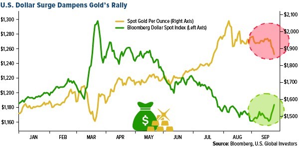 - The key driver of gold prices right now is the U.S. dollar – and it’s making a comeback. The two assets historically trade in the opposite direction. The dollar’s vigor is linked to fading hopes of another stimulus package from the U.S., but it shouldn’t last since Federal Reserve policy will remain expansionary for years.