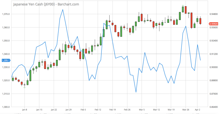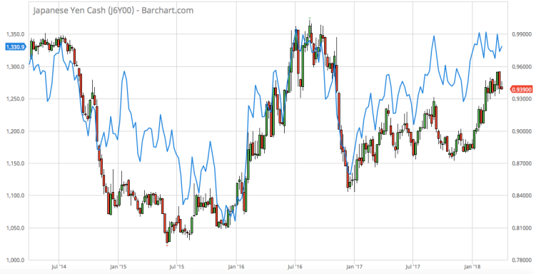 If we bring this chart up-to-date and look at just the past four years, we see the result below. Note that the inverse of the USDJPY is in candlesticks, and the continuous COMEX gold contract is displayed as a blue line.