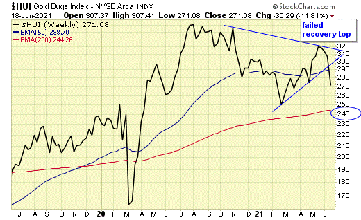 Similar to gold, $HUI also broke support, with next support at the 200ema, around 240