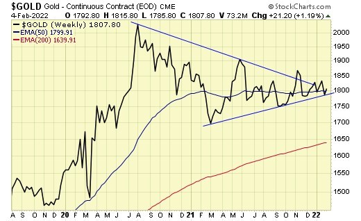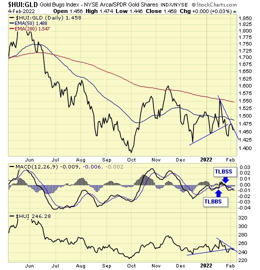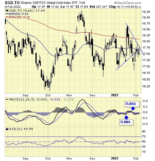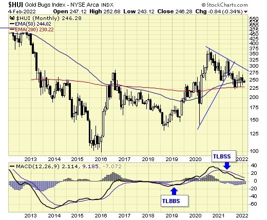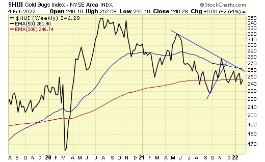 Trend is down for gold stocks, but holding support at the 200ema.