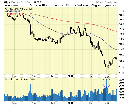 ABX – a major component in GDX, had a very high volume day early this month, and has marked a bottom so far.