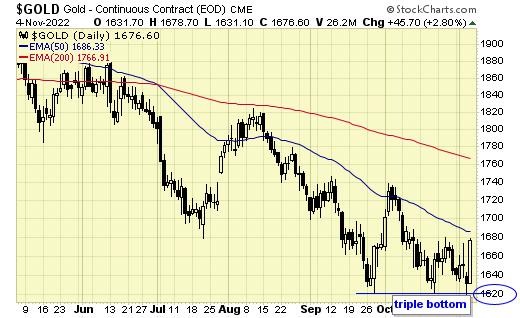 Gold prices bounced sharply off support at $1620, resulting in a triple bottom so far.