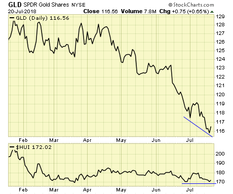 Our ratio between gold and gold stocks has broken out to a multi-month high and is currently pulling back.