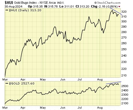 There is now a divergence between gold and gold stocks.