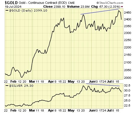 Gold broke out to a new high this week while silver at a lower high, thus resulting in a divergence.
