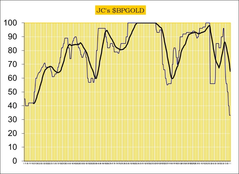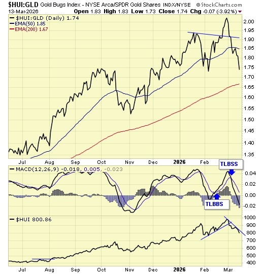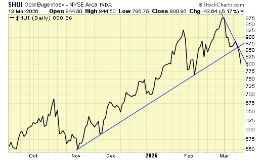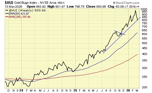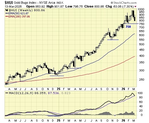 Therefore, longer term traders/investors should continue to hold and exit only on a weekly close below 750 on the $HUI.