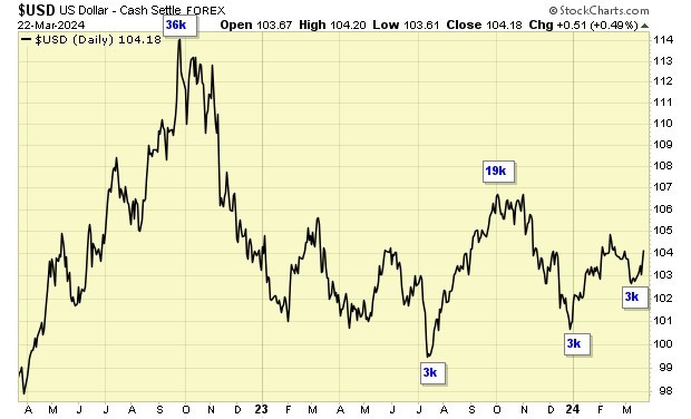 Trend is up for USD and down gold stocks.