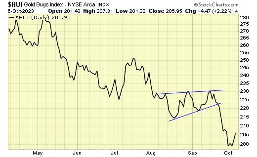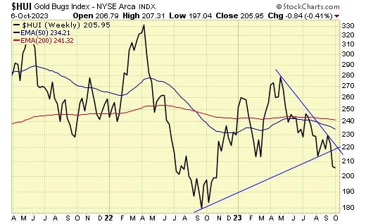 Gold stocks broke down last week.