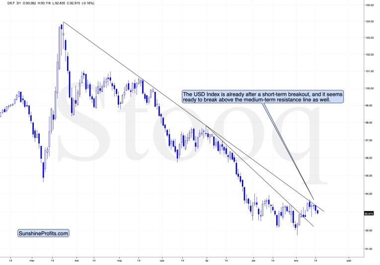 That’s exactly what happened in the miners yesterday. They moved higher. They didn’t move above their September highs, so this move was not a big deal (just as the one in gold), but it was enough to make the current triangle-vertex-based reversal point bearish. Based on this point, it seems that miners are ready to decline. Perhaps this is the way in which – very indirectly – the markets “are saying” that the USD Index is about to break above its declining resistance line.