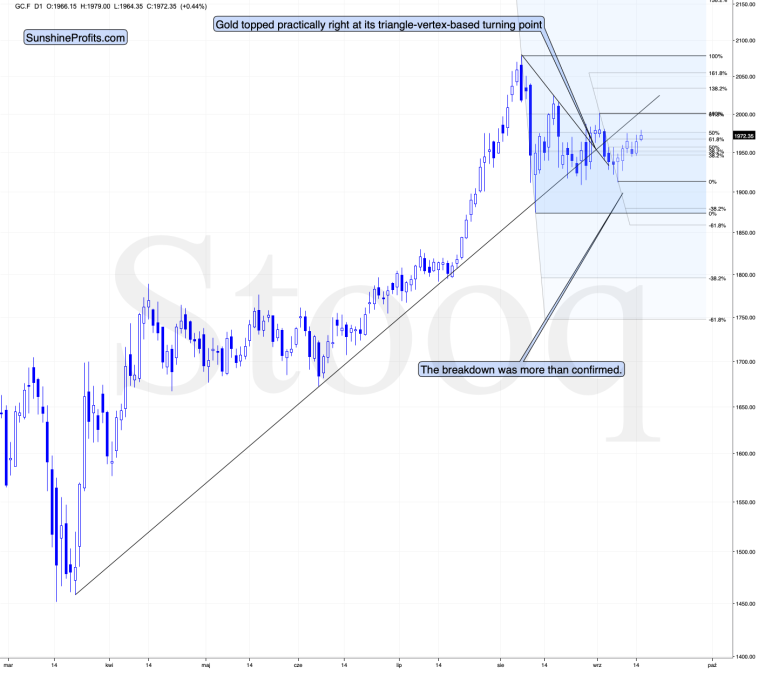 Once again, we saw just that. Gold rallied one more time, but it managed to rally back above the previously broken resistance. The breakdown was therefore confirmed, and the outlook remains very bearish, especially given the indications from gold’s long-term chart and its self-similar pattern.