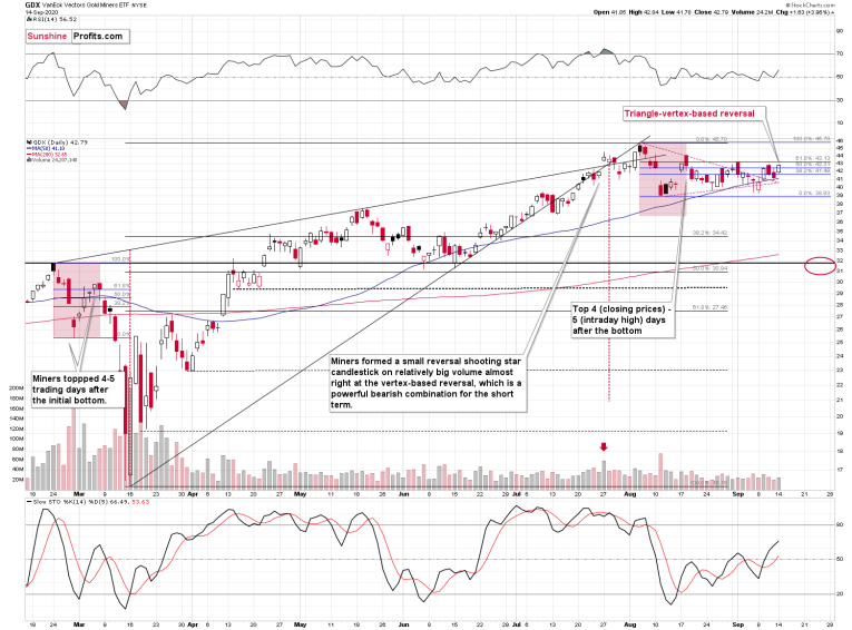 Now, since the general stock market moved above the previous highs and continues to rally, we might or might not see a sizable decline early this week. Back in March, the slide in miners corresponded to the decline in the general stock market, and this could be repeated, or we could see some sideways trading after the slide resumes, once stocks finally decline.
