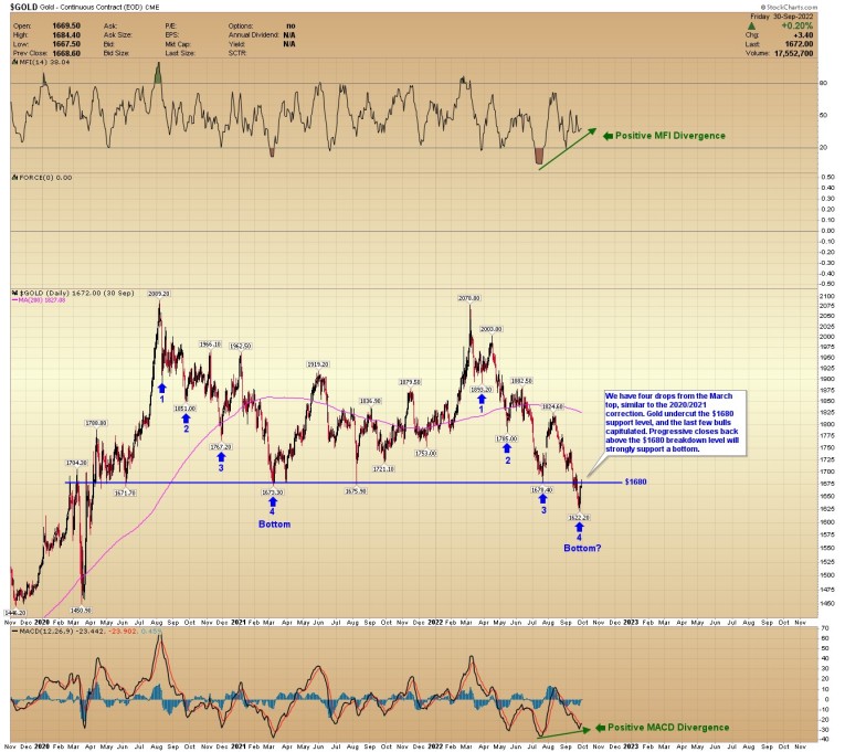 We have four drops from the March top, similar to the 2020/2021 correction. Gold undercut the $1680 support level, and the last few bulls capitulated. Progressive closes back above the $1680 breakdown level will strongly support a bottom.