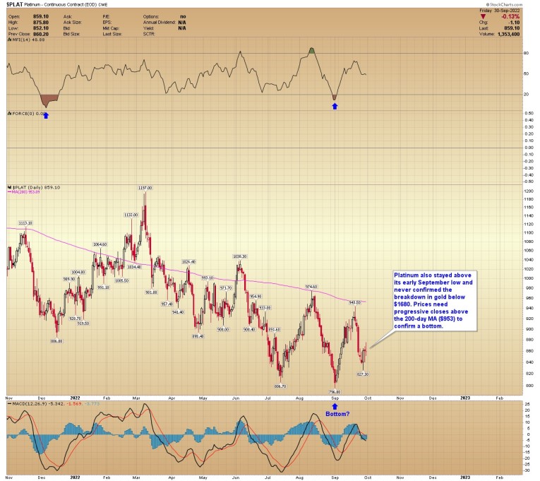 PLATINUM CHART: Platinum also stayed above its early September low and never confirmed the breakdown in gold below $1680. Prices need progressive closes above the 200-day MA ($953) to confirm a bottom.