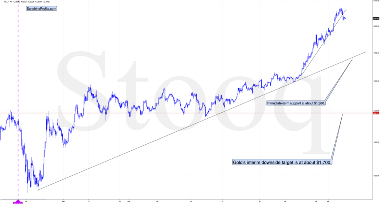 The interim downside target is the rising support line, which is at about $1,880 right now, but before gold reaches it, it’s likely to be closer to $1,900.