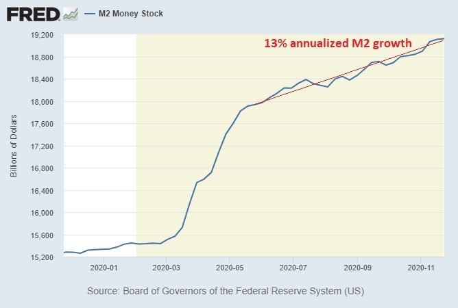 Meanwhile, after the one-time massive increase in broad money supply that occurred in the spring of this year due to the CARES Act, the broad money supply is still growing at a 13% annualized rate, which is rather structural at this point, even without specific stimulus: