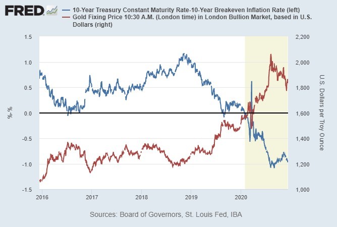 After a strong 2019, the gold price took a hit in March 2020 as global liquidity evaporated and real interest rates spiked. However, the inevitable policy response of rate cuts, massive QE, and huge fiscal deficits quickly unwound that deflationary crunch and sent many risk assets soaring, and gold was well-positioned to ride that wave to new highs. Then, in August 2020, real Treasury rates began to rise, which led to a healthy correction in the gold price from near-term overbought conditions.