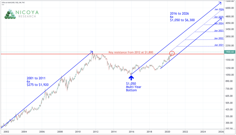 The recent breakout above resistance at $1,800 (red circle in the chart) was very significant for gold and was followed by a quick rally of an additional $100 to $1,900 per ounce. And there is plenty of upside left in this rally in our view, with the price still below the mid-point of the trend channel. If we use the last major bull cycle in gold as a guide, we forecast the price to climb toward $6,000 by the start of 2026. This would represent another 10-year cycle and 6x move from the December 2015 bottom around $1,050.