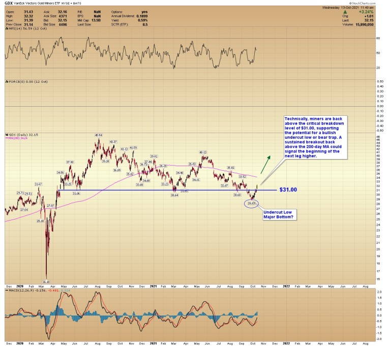 Technically, miners are back above the critical breakdown level of $31.00, supporting the potential for a bullish undercut low or bear trap. A sustained breakout back above the 200-day MA could signal the beginning of the next leg higher.