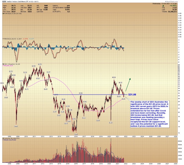 The weekly chart of GDX illustrates the significance of the $31.00 price level. It took GDX seven years (2013 to 2020) to breakout above $31.00. After the post-Covid spike, prices extended too far too fast and have been correcting. Recently, GDX broke below $31.00, but that breakdown was fleeting (possibly a bear trap). Prices have since recaptured the $31.00 support level, and I see the potential for a significant bottom if prices maintain $31.00.