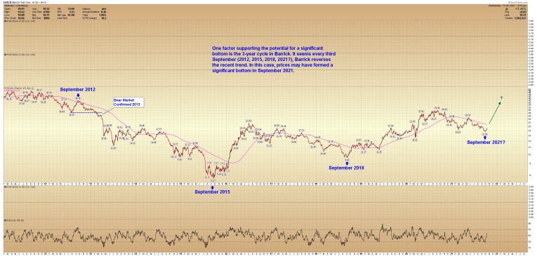 One factor supporting the potential for a significant bottom is the 3-year cycle in Barrick. It seems every third September (2012, 2015, 2018, 2021?), Barrick reverses the recent price trend. In this case, prices may have formed a significant bottom in September 2021.
