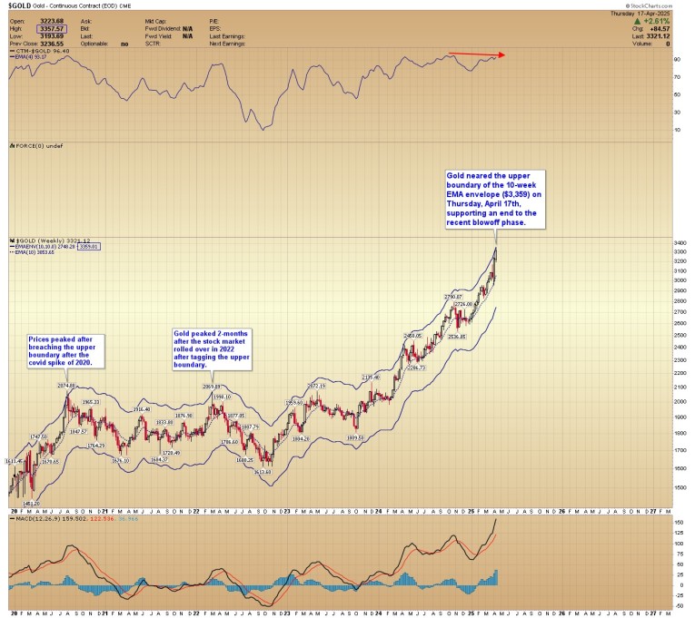 On Thursday, April 17th, gold approached the upper boundary of its 10-week EMA envelope ($3,359), signaling a potential end to the recent blowoff phase. Notably, a similar pattern played out in 2022, when gold peaked roughly two months after the stock market began to decline—also after touching this upper boundary. A comparable peak occurred in 2020 under the same conditions.