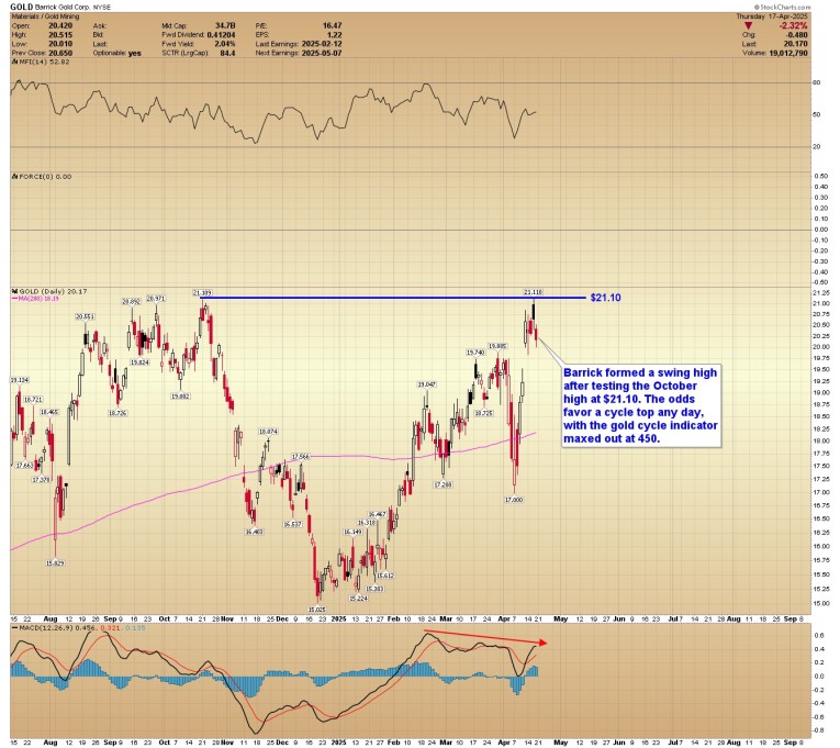 BARRICK: Barrick formed a swing high after testing the October high at $21.10. The odds favor a cycle top any day, with the gold cycle indicator maxed out at 450.