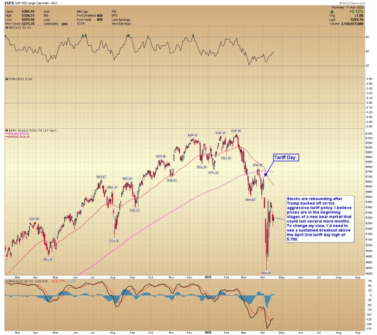 S&P 500: Stocks are rebounding after Trump backed off on his aggressive tariff policy. I believe prices are in the beginning stages of a new bear market that could last several more months. To change my view, I’d need to see a sustained breakout above the April 2nd tariff day high of 5,700.