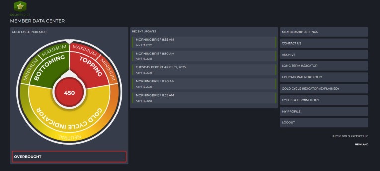 Our Gold Cycle Indicator is at 450, reaching maximum cycle topping. This happens just once every few years and is usually followed by an average 20% decline, once the final peak is in.