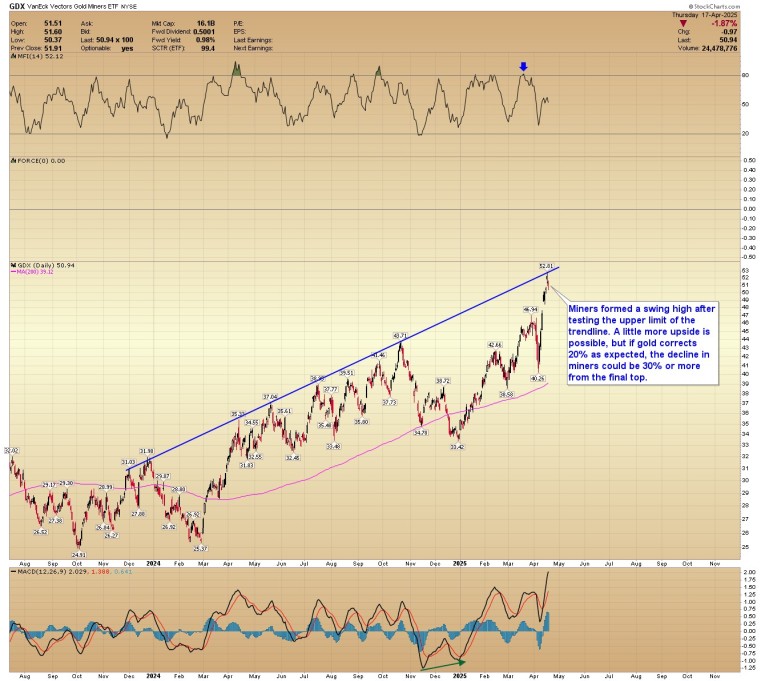 GDX: Miners formed a swing high after testing the upper limit of the trendline. A little more upside is possible, but if gold corrects 20% as expected, the decline in miners could be 30% or more from the final top.