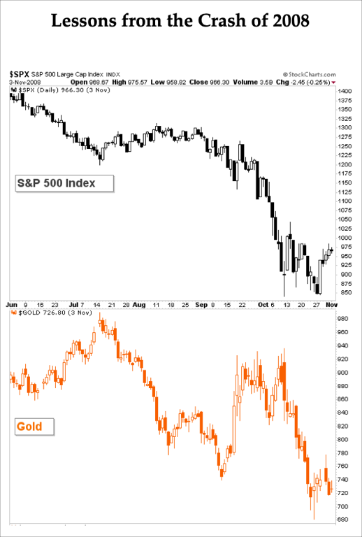 We need look back no further than the Crash of 2008 to remember that during the worst of the decline, gold fell together with stocks: