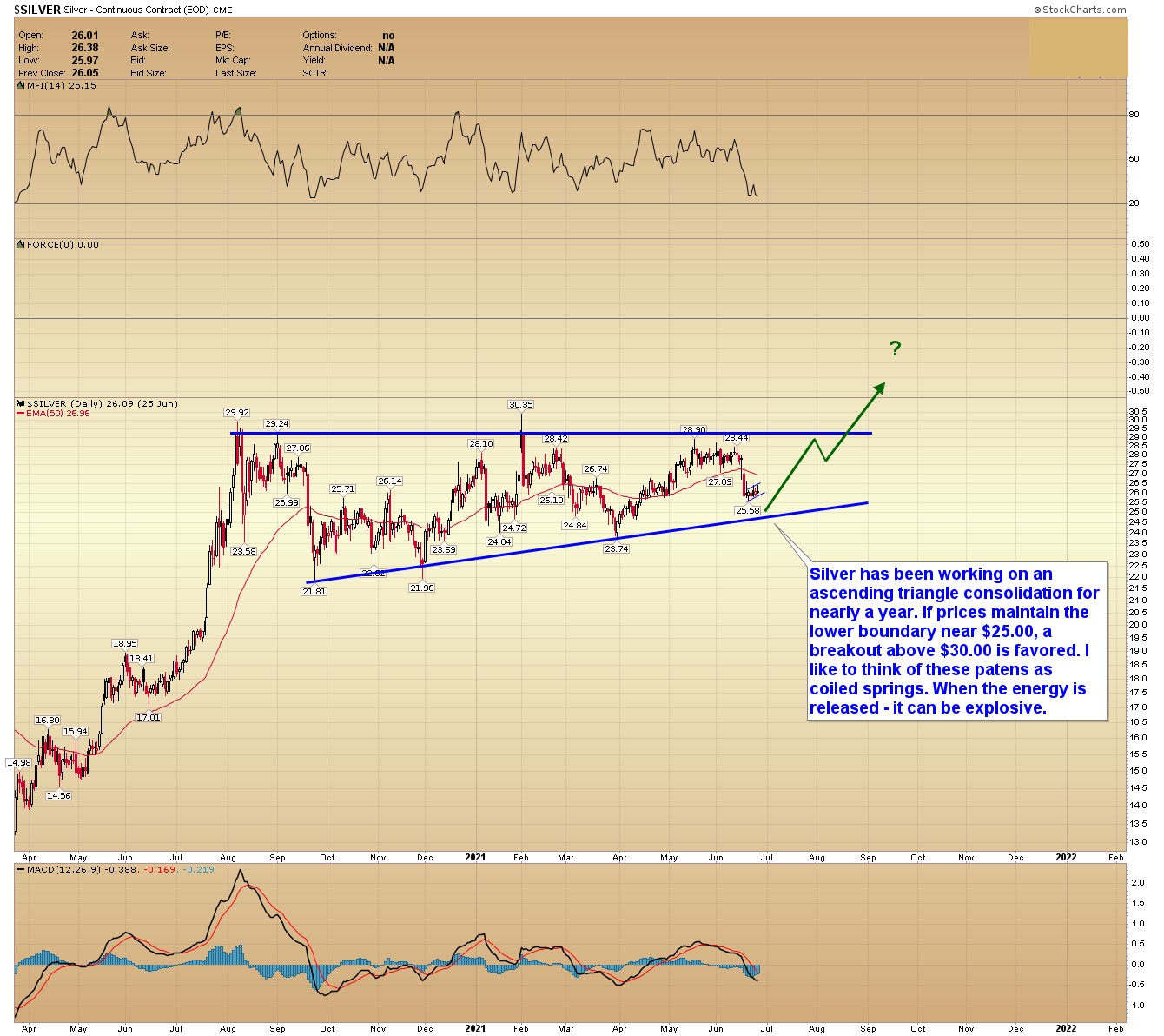 Silver prices have been working on an ascending triangle consolidation for nearly a year. If prices maintain the lower boundary near $25.00, a breakout above $30.00 is favored. I like to think of these patens as coiled springs. When the energy is released - it can be explosive.
