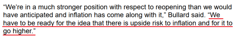 To that point, with the FED’s critics growing louder by the day, even its own members are sounding the alarm on inflation. Case in point: after St. Louis FED President James Bullard told CNBC on Jun. 18 that officials saw “more inflation than we were expecting” and added that “I think it’s natural that we’ve tilted a little bit more hawkish,” he reiterated his stance on Jun. 21.