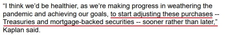 Singing a similar tune, Dallas FED President Robert Kaplan also said on Jun. 21 that the liquidity splurge has run its course and that “the issue on the table today and in the near term is the timing and adjustment of these purchases.”