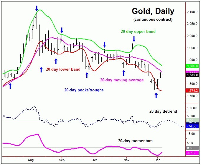 From my 11/29/20 article: "Once the next 10 and 20-day cycle low is set in place, then the odds will favor a rally back to the 20-day moving average or better into what is projected to be the first week or so of December. In terms of patterns, due to the configuration of the larger 72 and 154-day cycles, that move is currently anticipated to end up as a countertrend affair - with resistance at or near the upper 20-day cycle band."