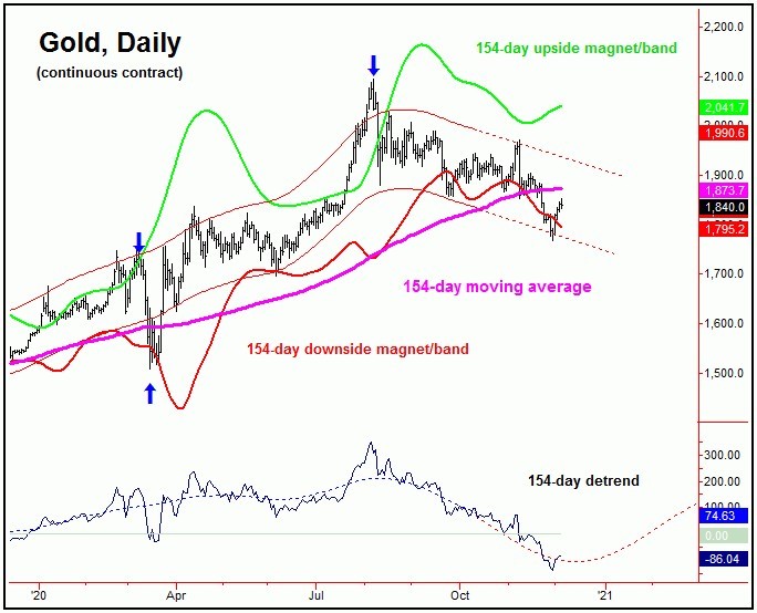 With the configuration of each of the 72-day and 154-day cycles - which are at or into bottoming range - Gold 2200 may come sooner than you think. That is, the larger swing down has either already bottomed, or else has a marginally lower low to go before doing so. Will you be prepared for the next upturn?