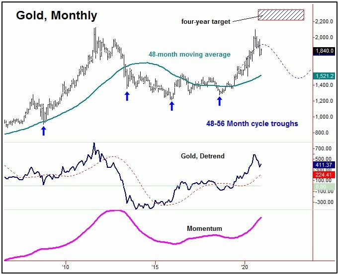 With the above chart, we can clearly see our open four-year target, with both momentum and our detrend indicators still moving higher - thus keeping the upward phase of this cycle firmly intact.