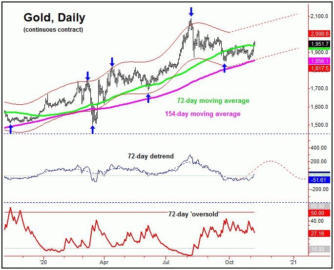 From my August 30th, 2020 article: "our 310-day chart offers up some key additional information. That is, the channel that encloses the action comes from this same 310-day cycle, and - for this channel to remain pointing higher - any price decline would need to hold at the bottom of the same (plus or minus). The bottom of this 310-day cycle channel is currently around the 1830's for gold (December, 2020 contract). In other words, if this level should be tested at any point going forward, it would be the most ideal re-entry for the long side of the market."