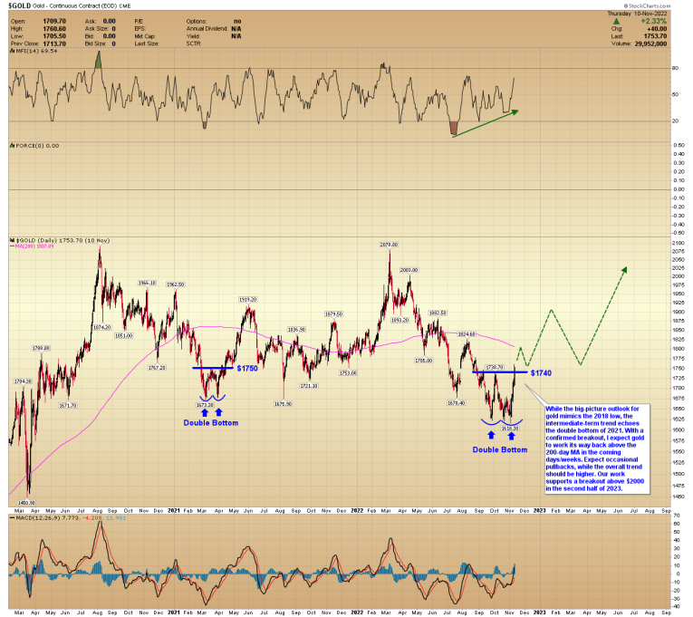 While the big-picture outlook for gold mimics the 2018 low, the intermediate-term trend echoes the double bottom of 2021. With a confirmed breakout, I expect gold to work its way back above the 200-day MA in the coming days/weeks. Expect occasional pullbacks, while the overall trend should be higher. Our work supports a breakout above $2000 in the second half of 2023.