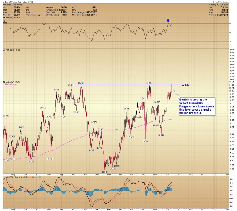 BARRICK: Barrick is testing the $21.00 area again. Progressive closes above this level would signal a bullish breakout.