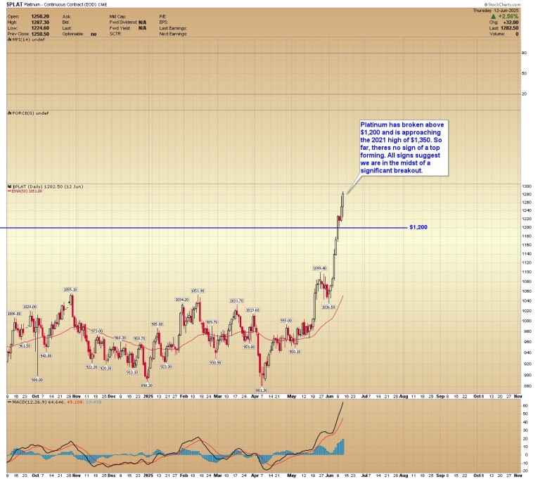 Platinum has broken above $1,200 and is approaching the 2021 high of $1,350. So far, there’s no sign of a top forming. All signs suggest we are in the midst of a significant breakout.