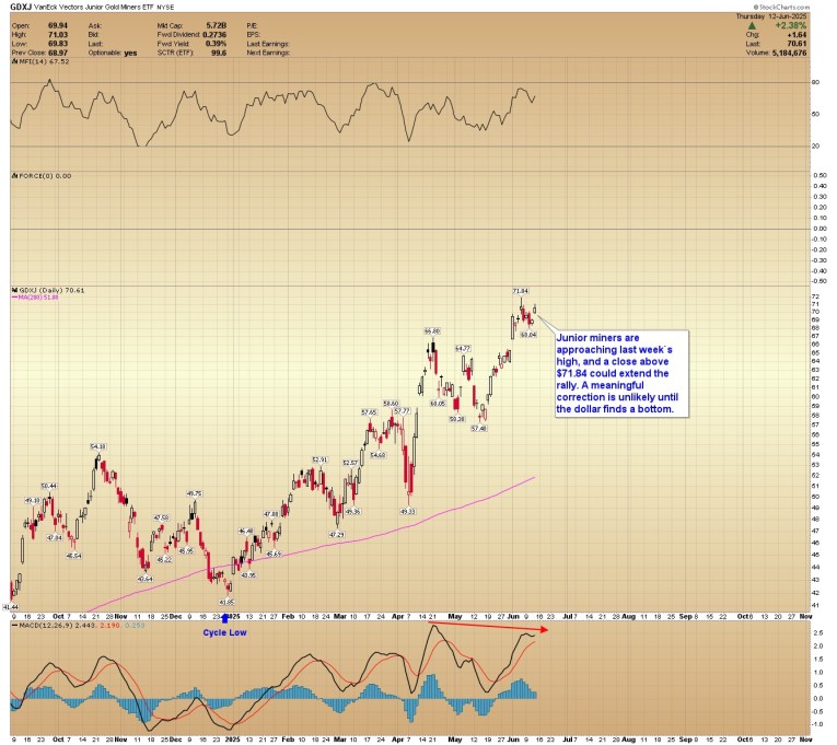 GDXJ: Junior miners are approaching last week's high, and a close above $71.84 could extend the rally. A meaningful correction is unlikely until the dollar finds a bottom.