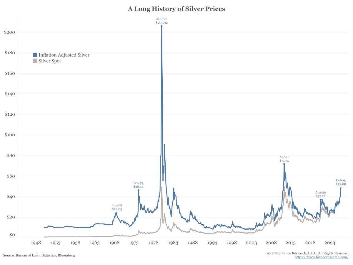 Spot silver breached $50 on Thursday, echoing the nominal highs of 1980 and 2011. However, when adjusted for inflation, silver would need to rally above $200 to match its true 1980 peak. With the growing structural supply deficit in silver, I believe not only is $200 achievable, but we could see much higher prices later this decade.