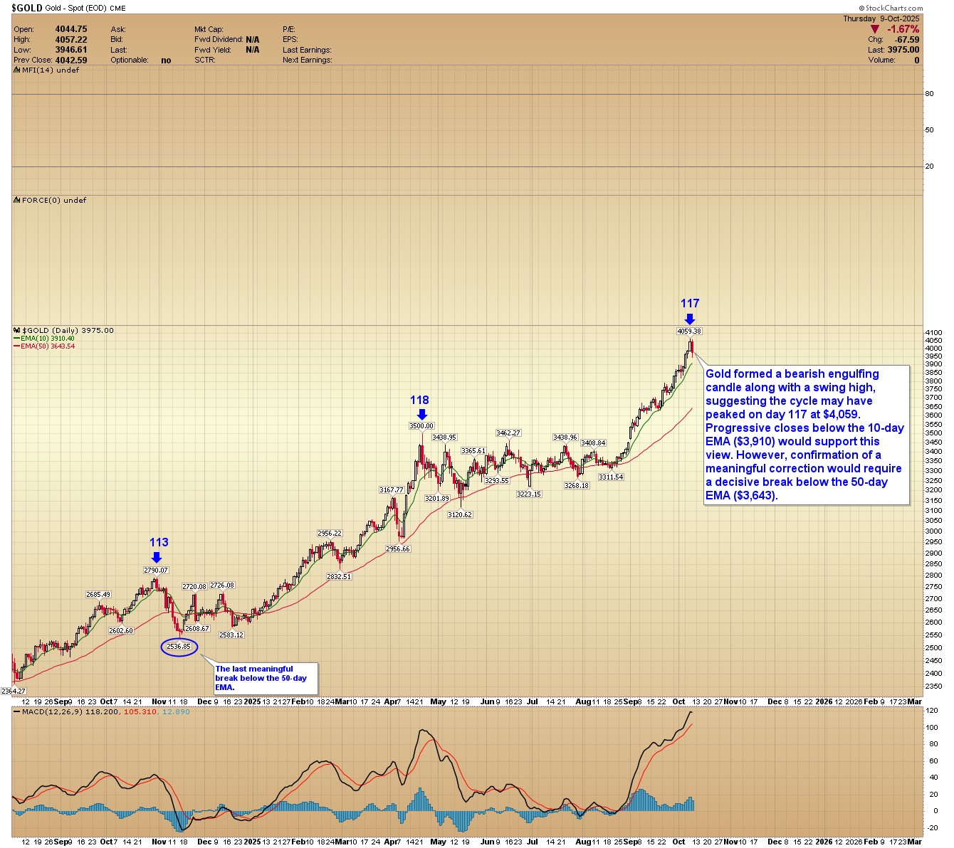 GOLD DAILY: Gold formed a bearish engulfing candle along with a swing high, suggesting the cycle may have peaked on day 117 at $4,059. Progressive closes below the 10-day EMA ($3,910) would support this view. However, confirmation of a meaningful correction would require a decisive break below the 50-day EMA ($3,643).