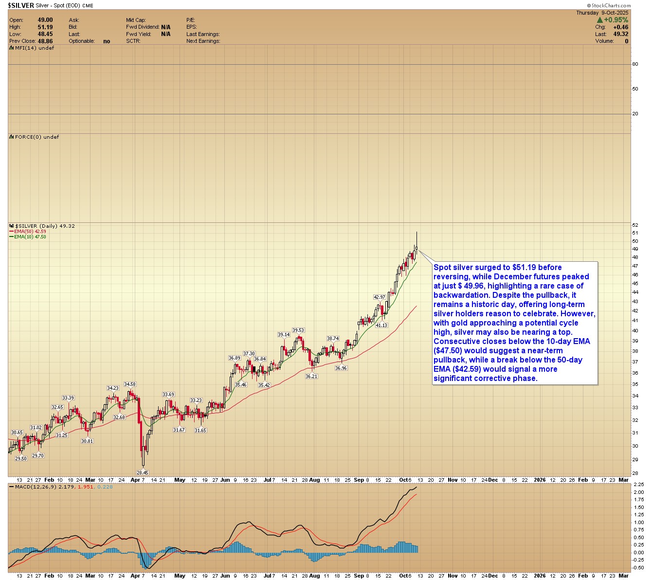 SILVER: Spot silver surged to $51.19 before reversing, while December futures peaked at just $49.96, highlighting a rare case of backwardation. Despite the pullback, it remains a historic day, offering long-term silver holders reason to celebrate. However, with gold approaching a potential cycle high, silver may also be nearing a top. Consecutive closes below the 10-day EMA ($47.50) would suggest a near-term pullback, while a break below the 50-day EMA ($42.59) would signal a more significant corrective phase.