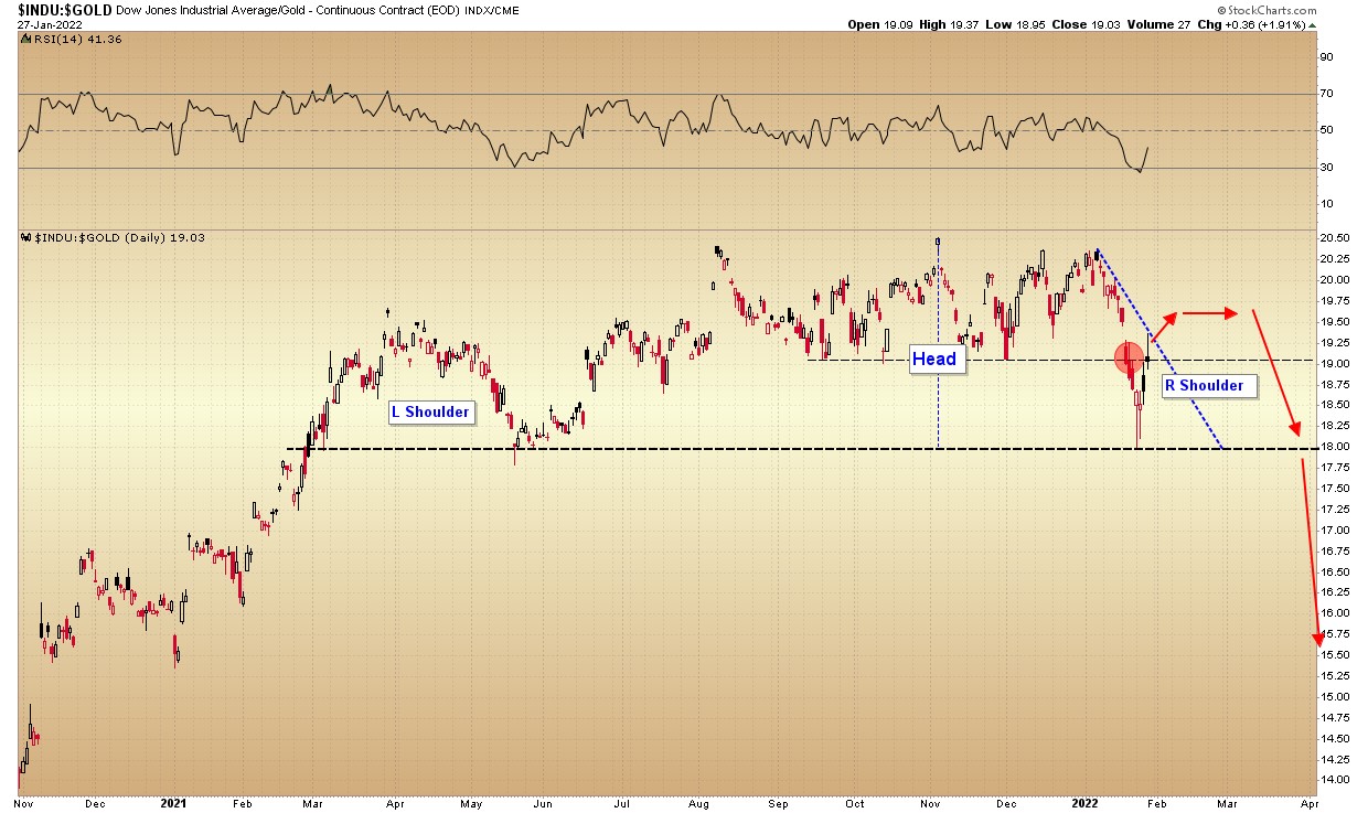 Zooming the Dow to gold ratio in to the last year reveals a classic topping pattern: a head and shoulders formation (blue), which bears its name from a loose resemblance to a human silhouette, with a more prominent head sticking out above two shoulders.